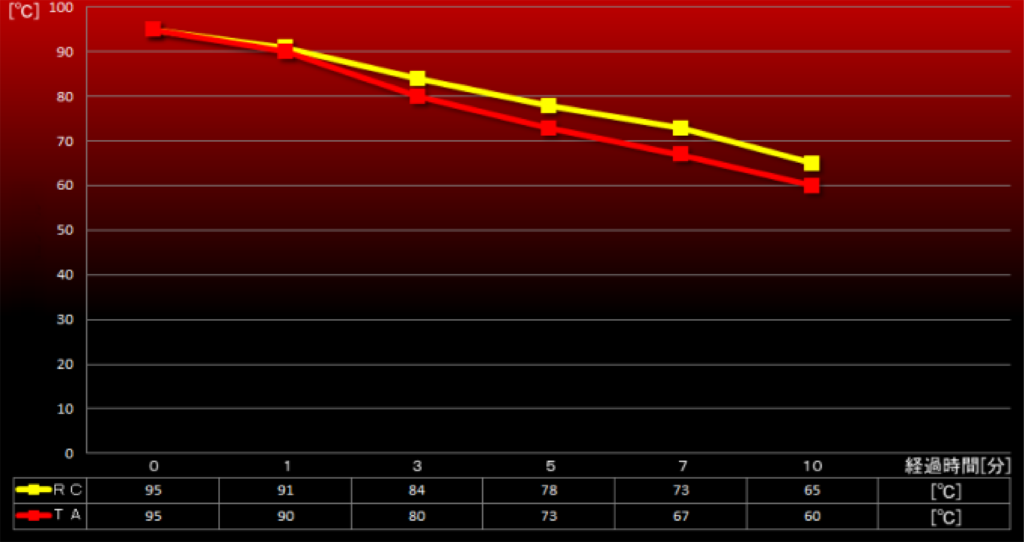 PG55 RCとTAを95℃まで熱し、一定の風を当てて双方の冷却温度を検証実験したときの結果はこちらです。